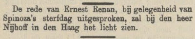 Wel grappig te zien dat Renan blijkbaar had gedacht die rede te houden bij de onthulling van het Haagse Spinozamonument, maar dat was er nog niet. De rede werd ook niet op 21 febr. 1877, Spinoza's sterfdag, maar op 22 febr. gehouden.