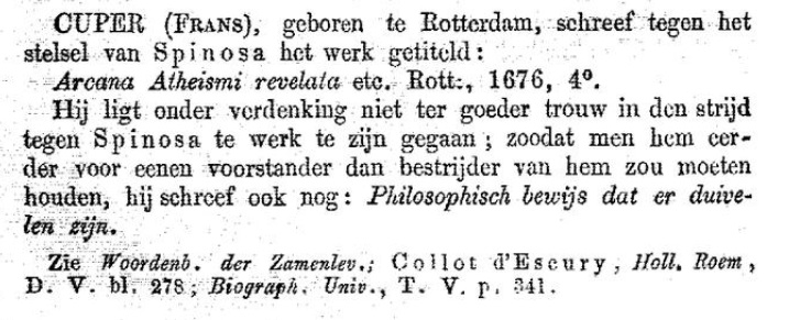 Frans Kuyper studied theology at the Remonstrant Seminarium (founded 1634) in Amsterdam. He was removed (1653) from his ministry in Vlaardingen because of his rejection of infant baptism. He then started (1663–73) a printing shop (Amsterdam, Brouwersgracht) and primarily issued Socinian works. See: NNBW, vol. 4, cols 868–9; Van Bunge, 1990b, pp. 90–8; Visser, 1995. An important participant and pamphletist in the so-called ‘Bredenburg disputes’, Kuyper actively denounced the rationalist determinism of Johannes Bredenburg. For further background: Fix, 1990; Scribano, 1995; Israel, 2002, p. 344. [Van Spinozaweb cf. ook Wikipedia en vooral de Post-Reformation Digital Library die links naar veel van Kuypers werken geeft]. Hier wat Van der Aa over hem geeft: