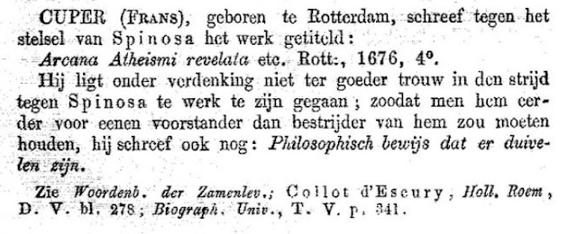 Vorig jaar, op 16 maart 2016, werd een exemplaar van de eerste editie van de Opera Posthuma [Amsterdam, 1677], dat samengebonden was met een exemplaar van Frans Kuyper's Arcana atheismi revelata, philosophice et paradoxe refutata examine Tractatus Theologico-Politici (Rotterdam, 1676) op een veiling verkocht voor 5,412 $ [Cf.] Inmiddels wordt het aangeboden voor US$ 13,950 [Cf. en cf.], terwijl de antiquair die er meer dan het dubbele voor vraagt niet eens goed gekeken heeft naar wat hij aanbiedt, want hij heeft het over "First Edition. Frans Kuyper's scarce refutation of Spinoza's "Tractatus Politicus"," terwijl dat werk nog moest verschijnen - het ging Arcana atheismi revelata [Geheimen van het atheïsme onthuld] om een bestrijding van de TTP. [En die zat niet in de Opera Posthuma].
