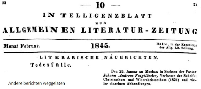 Nog wat kleine nagekomen feitjes. Zijn vader, Abraham Voigtländer, was pachter van het Riddergoed Graupzig, en sinds 1767 (naast anderen) Mitbelehnter aan het Riddergoed Korpitzsch. Abraham stierf op 7 augustus 1780, waarna zijn zoons Johann Andreas [dat jaar geboren], [later] Pastor zu Deutschenbohra, en Johan Georg, Pastor zu Liptitz hem in het Mitbelehnschaft opvolgden.
