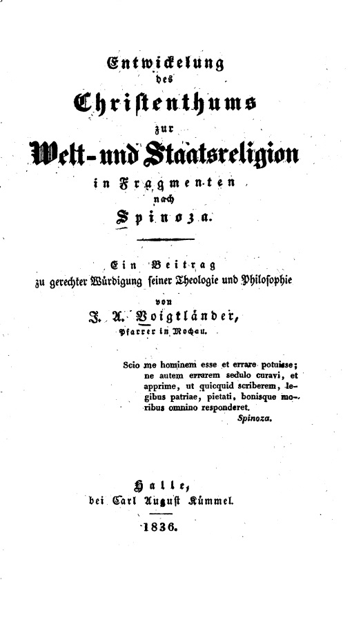 Entwickelung des Christenthums zur Welt- und Staatsreligion in Fragmenten nach Spinoza: Ein Beitrag zu gerechter Würdigung seiner Theologie und Philosophie. Halle: Kümmel, 1836. - 67 pp. Met daarbij deze notitie (Kommentar):