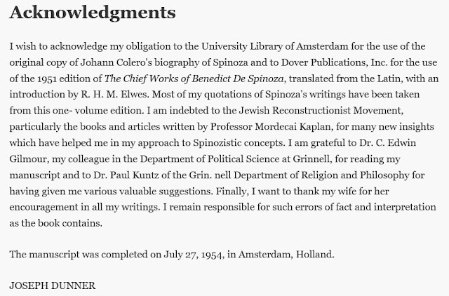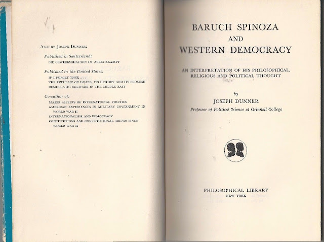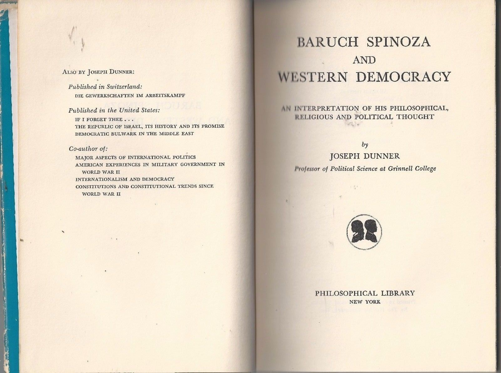 • Joseph Dunner, Baruch Spinoza and Western Democracy. An interpretation of his philosophical, religious and political thought. New York: Philosophical Library, [1955]. XII, 142 pp. [Cover van hier Het boek is in te zien bij Hathitrust]