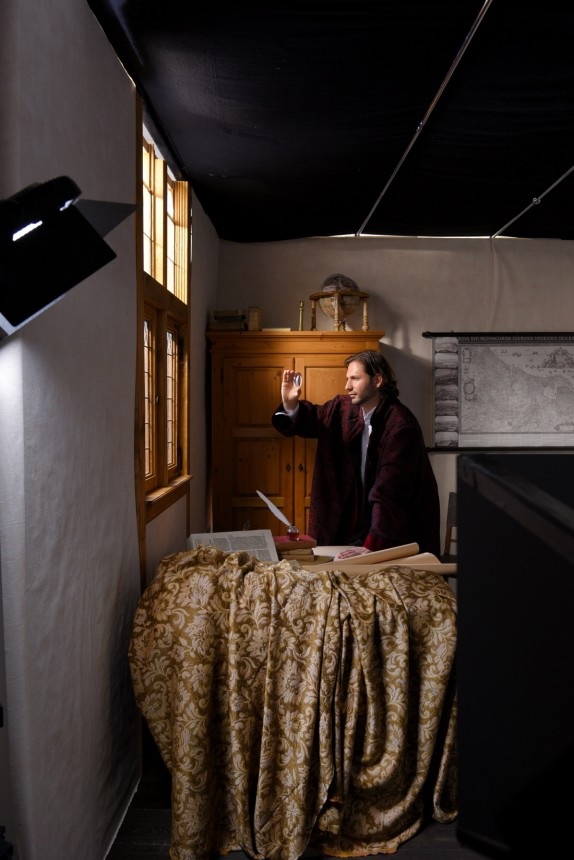 Sein Geld verdiente der Denker, der 1632, also im selben Jahr wie Vermeer, geboren ist, allerdings mit dem Schleifen von Linsen. Und deshalb wird später das Spinoza-Modell, im normalen Leben Store-Manager eines Modegeschäfts, den schweren roten Morgenmantel anziehen, eine Linse vor seinem Auge hin- und herwenden und im übertragenen Sinn einen neuen Blick auf die Welt werfen." Daarbij deze foto: