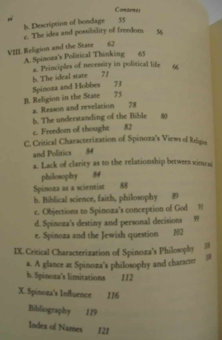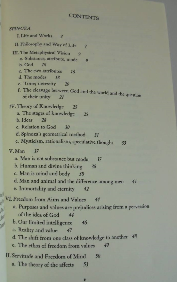 In zijn deel over Spinoza in Die großen Philosophen (1957) dat door Piper in 1964 apart als boek en in 1978 in paperback is uitgegeven [en dat onder redactie van Hannah Arendt in 1966 in het Engels is vertaald], behandelt Karl Jaspers Spinoza’s Metaphysische Vision in de volgende paragrafen: a) Substanz, Attribut, Modus; b) Gott, c) Die zwei Attribute; d) Die Modi; e) Die Zeit; die Notwendigkeit; f) Sprung zwischen Gott und Welt und die Frage nach ihrer Einheit.