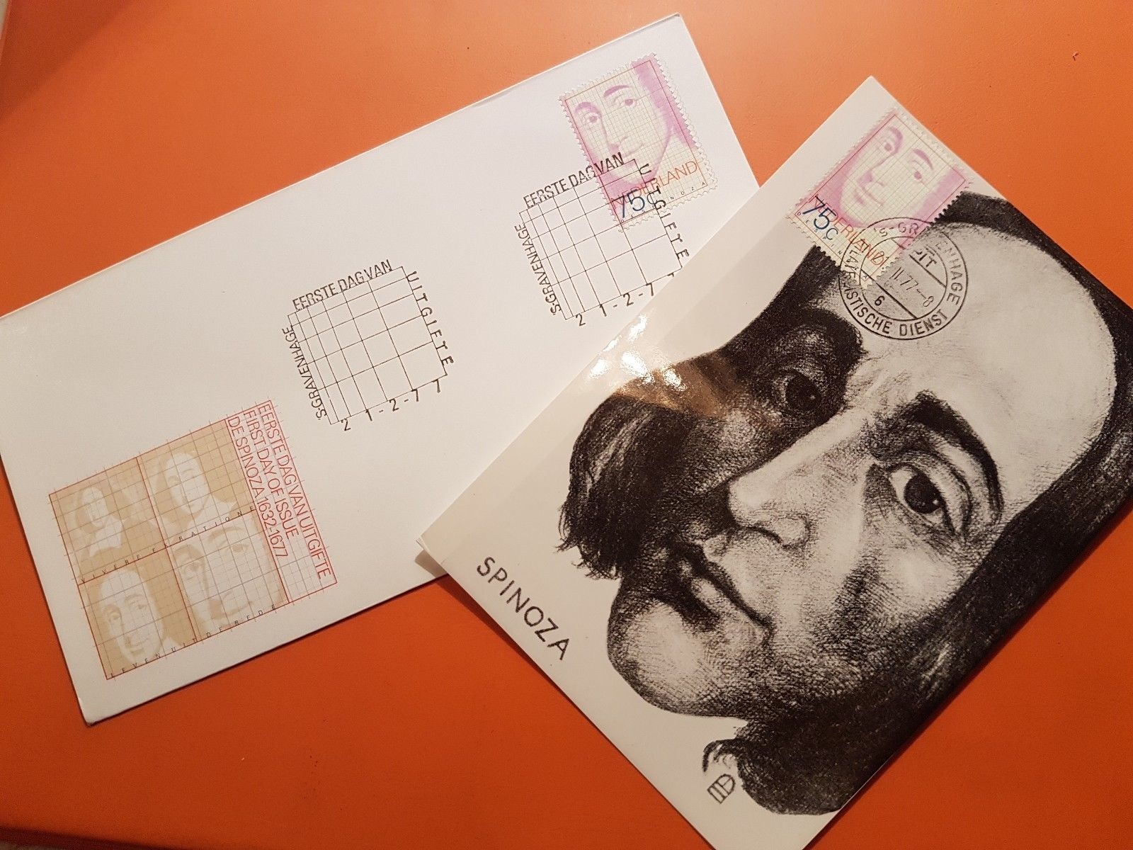met postzegel' die op 21 februari 1977 bij gelegenheid van Spinoza’s 300e