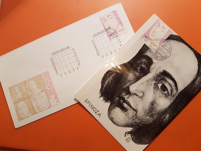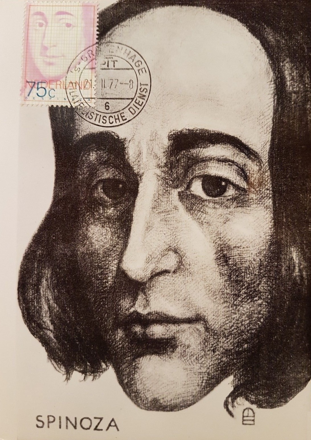 toch, zo’n kaart met een fraaie tekening van Spinoza met postzegel op de