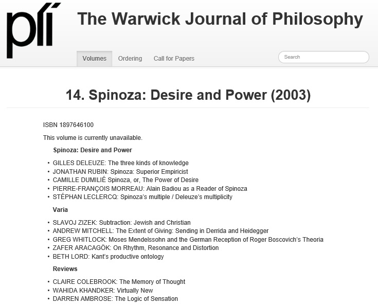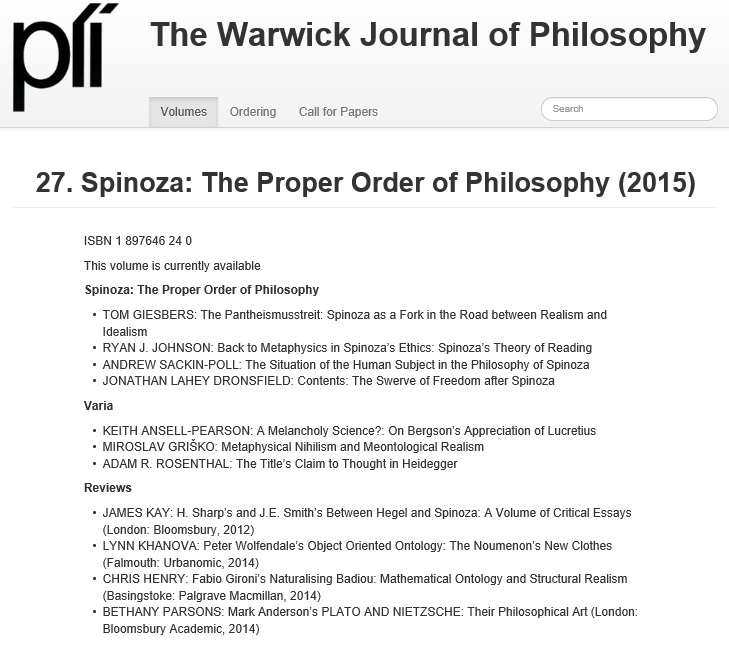 PLI, The Warwick Journal of Philosophy had in 2003 een speciaal nummer - #14 - over Spinoza.