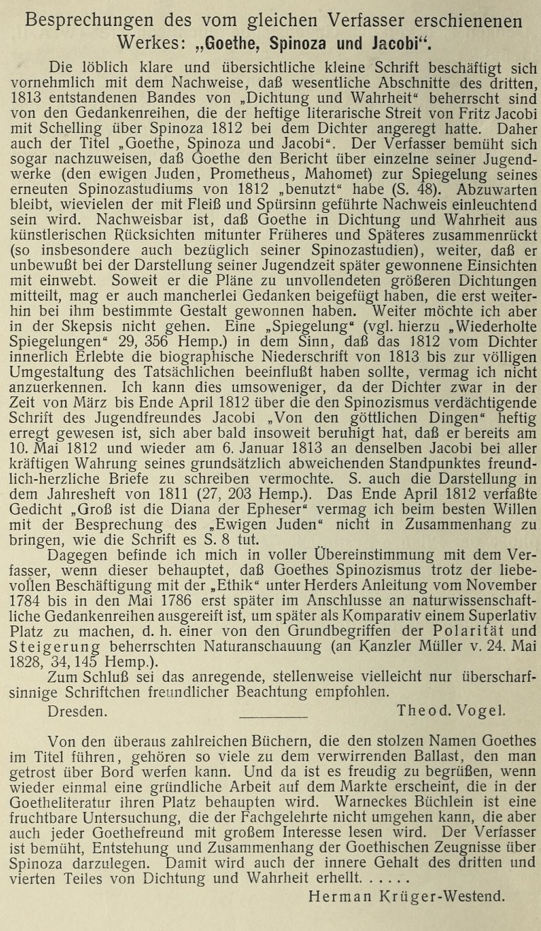 • Friedrich Warnecke, Goethe, Spinoza und Jacobi. Weimar: Hermann Böhlaus Nachfolger,