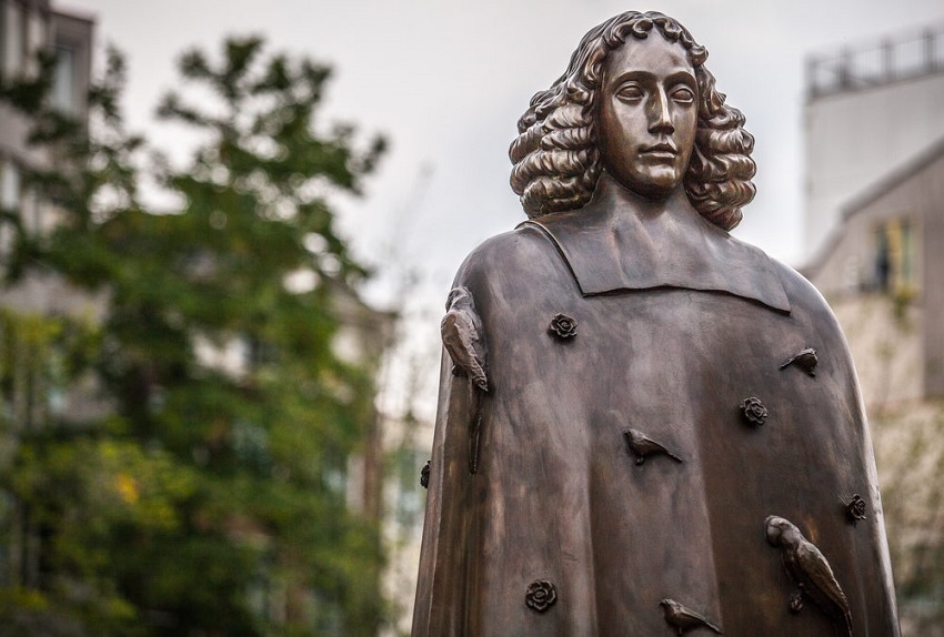 Nicolas Dings, de beeldhouwer van het Spinozabeeld bij de Stopera in Amsterdam, drukte Spinoza's verbondenheid met het vreemdelingschap uit met deze 'vreemde vogels' op zijn mantel "die verwijzen naar de culturele diversiteit van de stad" [PDF].