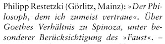 dat laatste onderwerp verscheen een jaar eerder zijn hoofdstukPhilipp Restetzki, »der Schlüssel zu Fausts Rettung«. >Streben< und >Liebe< als spinozistische Motive in den »Faust«-Szenen »Prolog im Himmel« und »Bergschluchten« In: Jochen Golz, Frieder von Ammon & Edith Zehm (Hrsg.), Goethe-Jahrbuch 133, 2016. Wallstein Verlag, 2017 – books.google, waarin het hoofdstuk in ’n geheel te lezen is. Hij werkt daarin verder uit, hetgeen Günter Mieth ruim dertig jaar geleden behandelde in