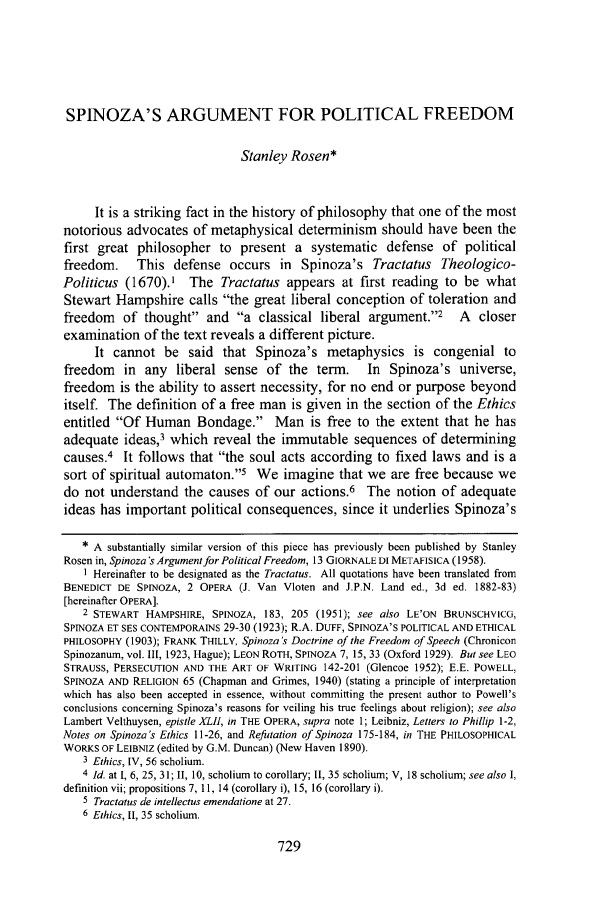 Cf. ook: Stanley Rosen, “Spinoza’s Argument for Political Freedom.” In: Cardozo Law Review 25 (2003): 729-741, waarvan hieronder de eerste pagina [Steven B. Smith, "What Kind of Democrat Was Spinoza? [In: Vol. 33, No. 1 (Feb., 2005), pp. 6-27"] verwijst in Note 2, "for the authoritarian dimension of Spinoza, see also" naar dit artikel] :