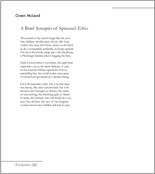 Owen McLeod teaches philosophy at Lafayette College in Easton, Pennsylvania, where he lives., makes pottery, and writes poems, which are published or forthcoming in such journals as Field, Massachusetts Review, New England Review, Ploughshares, and The Southern Review.” [Zijn website en Books.google].