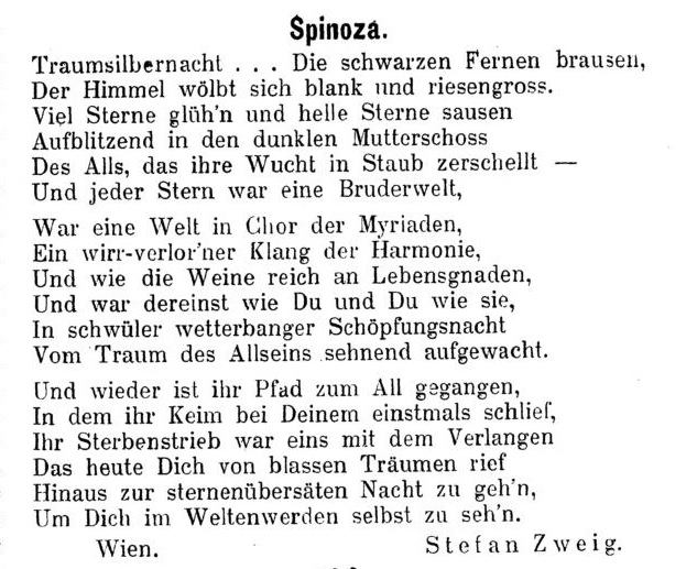 Spinoza, Gedicht, in: Die Welt. Zentralorgan der Zionistischen Bewegung, Jg. 5 1901, Heft 49 [50] (6. Dezember 1901), S. 13, te vinden op Compact Memory. Zweig was toen 20 jaar [ongeveer zoals op deze foto].