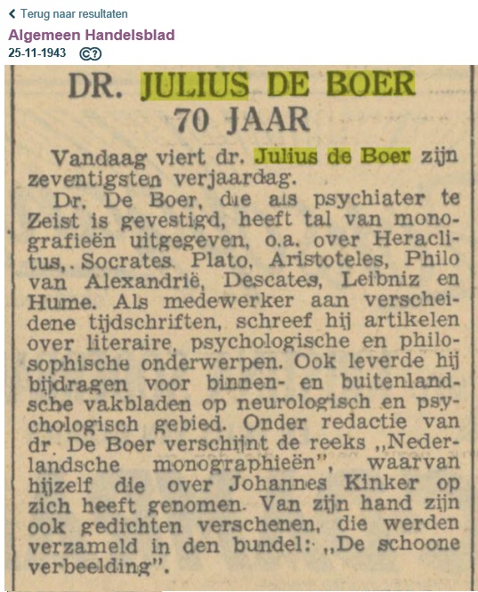 Tot mijn verbazing is er geen enkele pagina over deze Julius de Boer, (zenuw)arts/psychiater, dichter en filosoof te vinden. Ook de DBNL die een pagina over hem heeft, geeft geen biografische informatie. Dat ik in de kop van dit blog zijn levensdata kon geven, lukte mij na veel zoekwerk, voornamelijk in het kranten en tijdschriften-overzicht van de KB, Delpher genaamd. Ik geef enige berichten die ik uit Delpher opdiepte, zoals