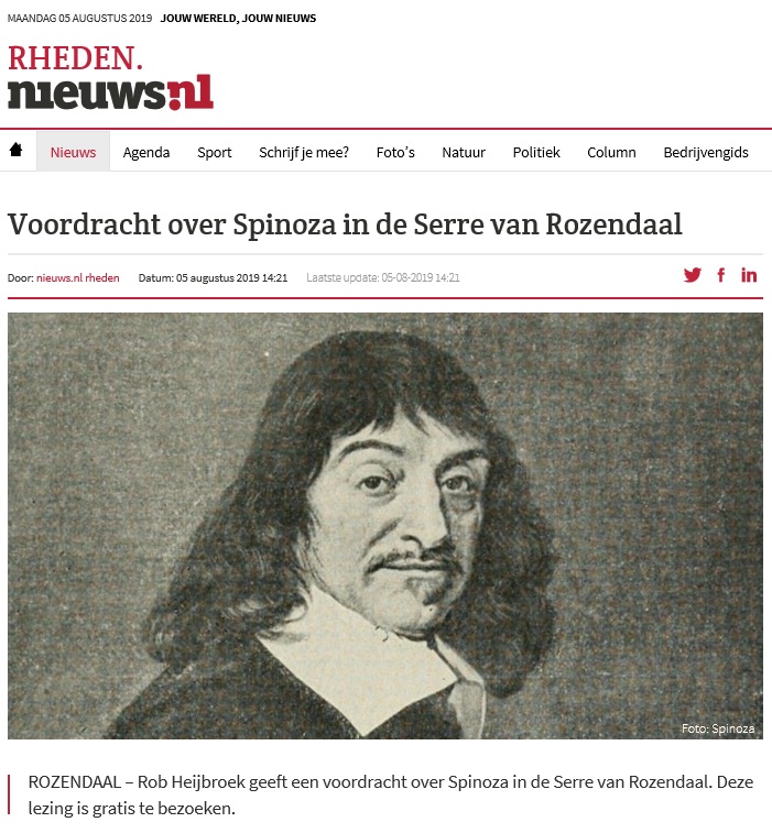 Wie is hier verantwoordelijk voor? Is het Rheden Nieuws.nl of misschien wel Rob Heijbroek? Ze leren het nooit daar in of bij Rheden. Net als in het voorjaar (cf. blog) plaatst de krant vandaag een afbeelding van Descartes bij een aankondiging van een lezing over Spinoza!