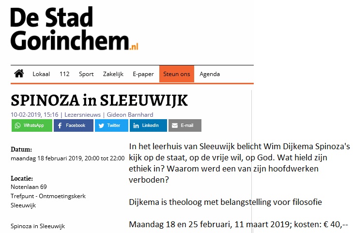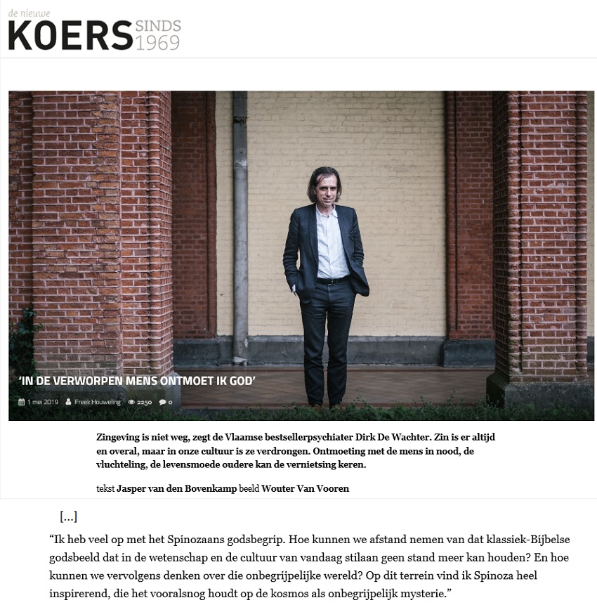 Wim Goris, die het artikel weer door een vriendin toegestuurd kreeg daar er een citaat over Spinoza in voorkwam, bracht mij op de hoogte van dit interview dat op 1 mei 2019 in het christelijk opinieblad De Nieuwe Koers verscheen. Het citaat heb ik eruit gelicht.