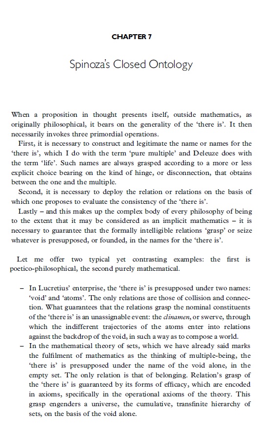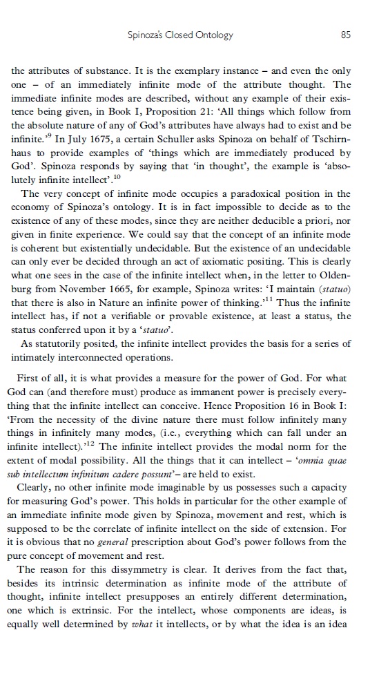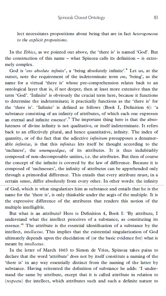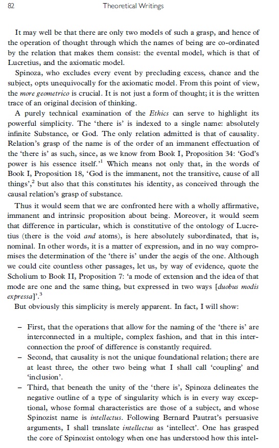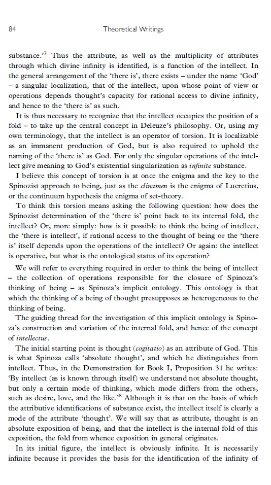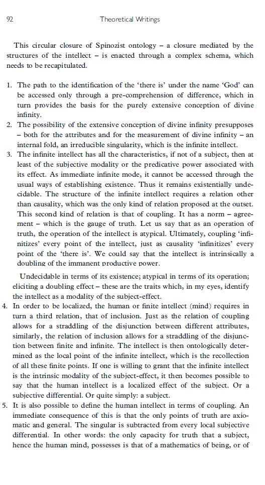 Het is geen eenvoudig artikel. Badiou geeft een uitgebreide analyse van "intellectus". Anders dan het attribuut (absoluut) denken (cogitatio) is intellect een modus van denken. Hij gaat na hoe het oneindige, resp, eindige intellect werkt / welke functie en welke ontologische status het heeft (ze hebben) binnen Spinoza's filosofie .