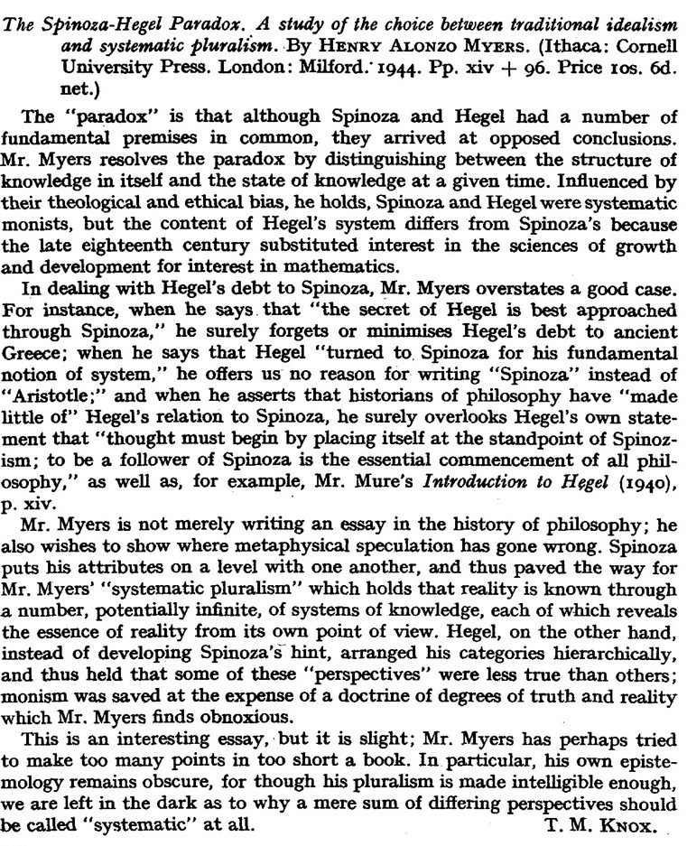 Alonzo Myers, The Spinoza-Hegel Paradox: